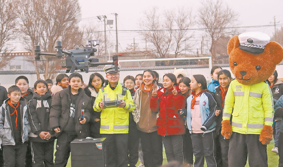 A+ | a1月7日,托克逊县公安局交警大队民警向学生们演示警用无人机。