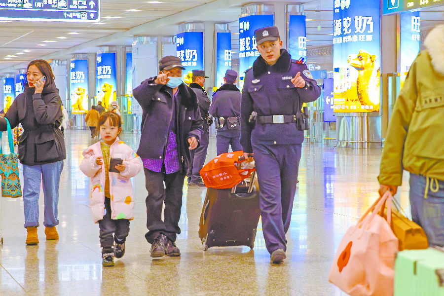 2月5日,乌鲁木齐站迎来春运返程客流高峰。乌鲁木齐铁路公安局乌鲁木齐铁路公安处乌鲁木齐站派出所“高铁蓝剑”志愿服务小分队民警开展安全宣传,为旅客排忧解难。图为民警帮带小孩的老人出站。