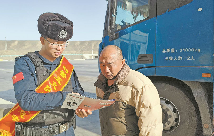 图为辅警向货车驾驶人宣传交通法规。石榴云/新疆法治报记者 单坤 摄
