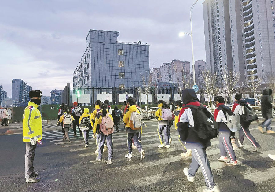 2月17日,乌鲁木齐市公安局交警支队经济技术开发区(头屯河区)大队民警在乌市第127中学门口护送学生过马路。当日,乌市中小学校开学,乌市公安交管部门在学校门口增设护学岗,为学生出行安全保驾护航。