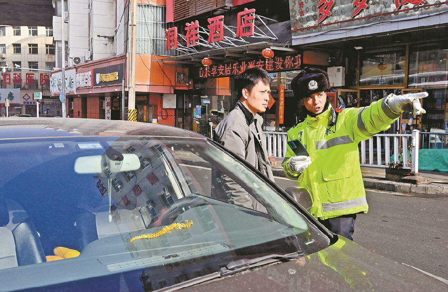 A+ | a2月26日,乌鲁木齐市公安局交警支队沙依巴克区大队友好路中队民警告诉违法停车的驾驶人附近停车场位置。
