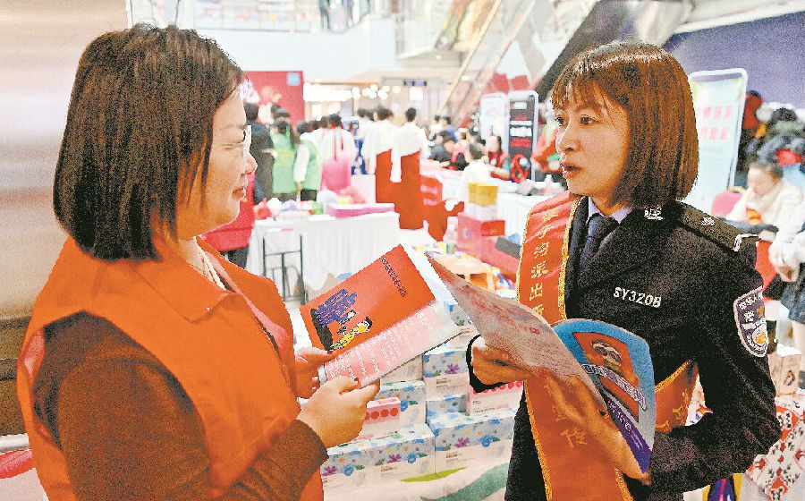 3月2日,由中共乌鲁木齐市委员会社会工作部联合共青团乌鲁木齐市委员会主办的“学习雷锋好榜样 传递青春正能量”——志愿服务集市活动在乌市沙依巴克区德汇万达商场开集。17支志愿者服务队现场为群众提供义诊、普法宣传、科普宣传等便民服务。图为志愿服务队成员、乌市公安局沙区分局碾子沟派出所辅警为群众讲解如何防范电信诈骗。