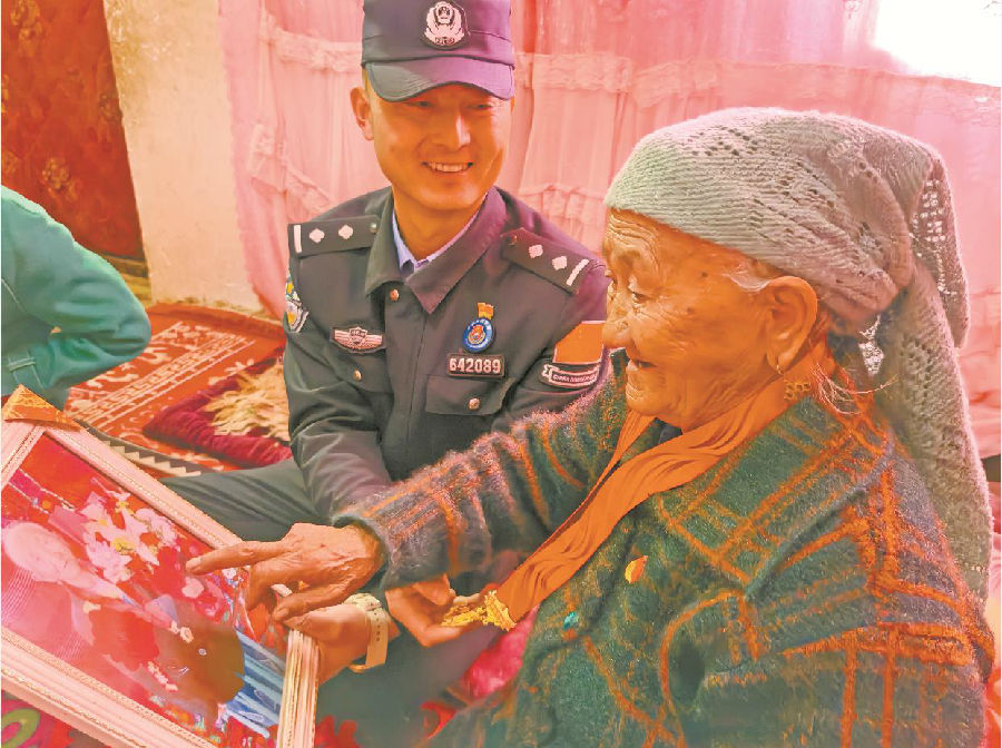 3月16日,新疆出入境边防检查总站克州边境支队哈拉奇边境派出所民警听辖区老党员讲述其获得“光荣在党50年”纪念章的故事。当日,该所组织民警慰问辖区老党员,了解他们的身体和生活状况,与他们一起追忆光辉岁月。 梁宇 摄