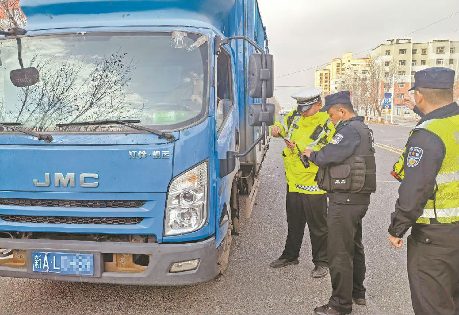 3月12日,兵团第十二师三坪垦区公安局交警大队与三坪垦区公安局五一派出所联合在辖区重点路段整治车辆交通违法行为。 宋春霞 摄