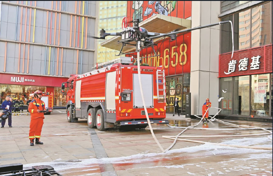 3月21日,乌鲁木齐市消防救援支队在乌市沙依巴克区德汇万达广场开展消防演练,演练中首次引入无人机灭火,提高了灭火效能。