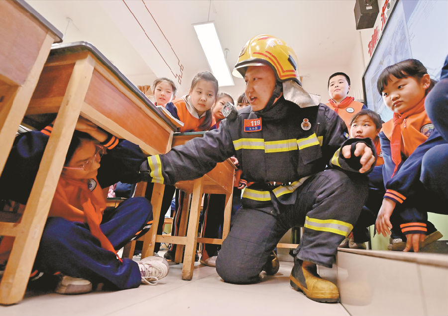 3月24日是第30个全国中小学生安全教育日。当日,乌鲁木齐市消防救援支队水磨沟区大队消防救援人员走进校园,向学生们讲解火灾预防、逃生自救等安全知识。图为消防救援人员向学生们讲解地震避险自救知识。 石榴云/新疆法治报记者 单坤 摄
