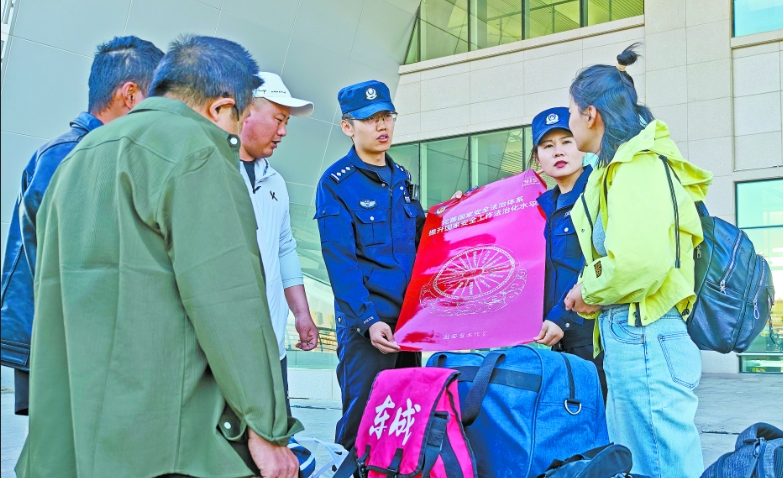 民警通过设立咨询台、发放宣传手册、现场讲解等方式,向旅客普及《中华人民共和国国家安全法》等法律法规,结合典型案例讲解危害国家安全的行为,营造“国家安全、人人有责”的浓厚氛围。 关同杰 摄