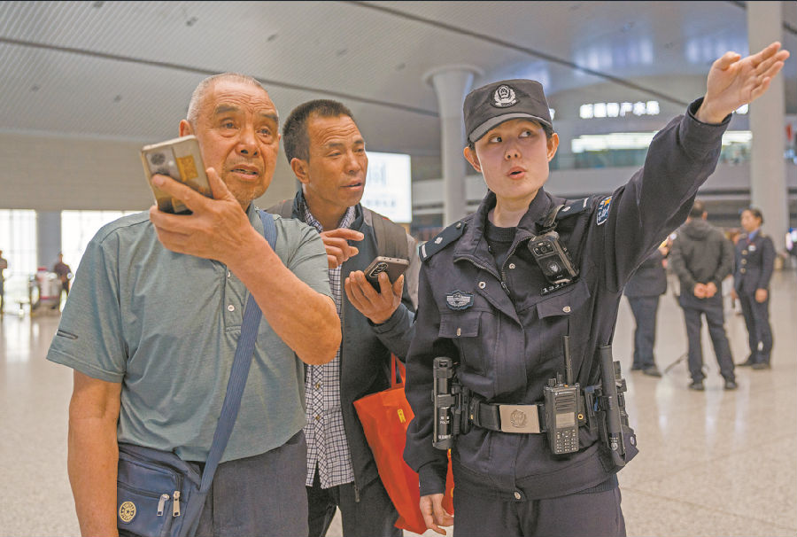 4月28日,乌鲁木齐铁路公安局乌鲁木齐公安处乌鲁木齐站派出所组织青年党员民警成立“青年志愿服务小分队”,在乌鲁木齐火车站候车室、售票厅、检票口、进出站口等人员密集、流动性大的地点加大巡逻频次,做好秩序引导,同时为旅客提供帮助和服务。图为民警在候车厅解答旅客问询。 石榴云/新疆法治报记者 单坤 摄