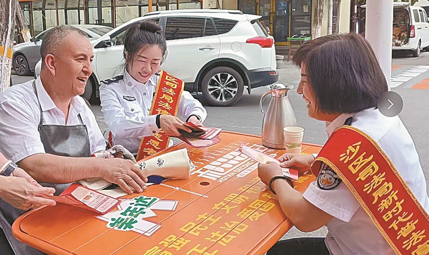 和田二街是游客来乌必选打卡地之一,普法工作者发放宣传折页和精美礼品,提醒游客购买商品时仔细检查,遇到质量问题依法维权。