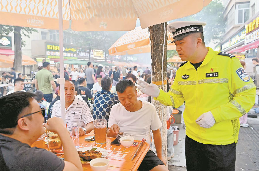5月18日,乌鲁木齐市公安局交警支队沙依巴克区大队民警向游客宣传交通安全知识。当日,该大队民警走进网红打卡地和田二街,通过发放交通安全宣传手册、面对面讲解等方式,引导游客遵守交通法律法规,安全文明游玩。 石榴云/新疆法治报记者 单坤 摄