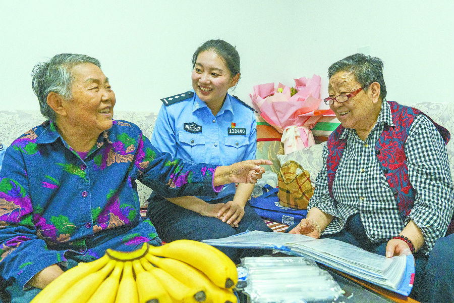 5月20日,乌鲁木齐铁路公安局乌鲁木齐公安处乌鲁木齐南站派出所“红石榴”志愿服务队民警与老人唠家常。当日,“红石榴”志愿服务队民警走进辖区敬老院,开展“反诈普法献温情 歌声舞影护桑榆”活动,增强老人的防骗意识,守住“钱袋子”。 石榴云/新疆法治报记者 单坤 摄