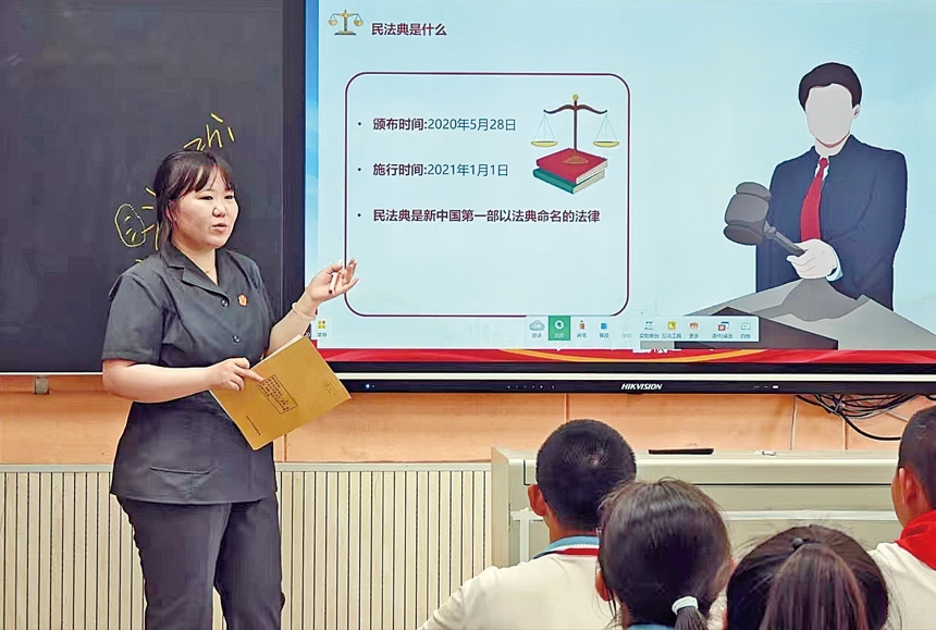 当日,该院开展以“‘典’亮青春 护航成长”为主题的普法宣传进校园活动。法官结合真实案例,讲解民法典中关于民事行为能力认定、民事侵权责任划分等法律条款。 李扬 摄