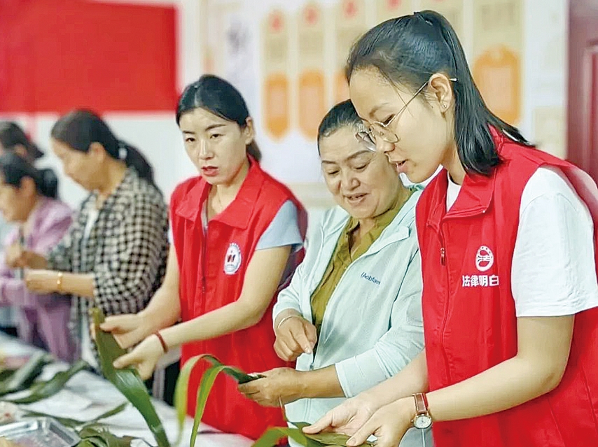 在第五师双河市,师市司法局八十六团司法所携手和兴苑社区开展“粽香里的法治课”主题活动,将法律知识与传统民俗巧妙融合。活动现场,司法所工作人员邀请“法律明白人”与社区职工群众一起捋粽叶、填糯米、封口、扎捆……其间,工作人员开展“包粽子 学法律”趣味问答,气氛融洽。
