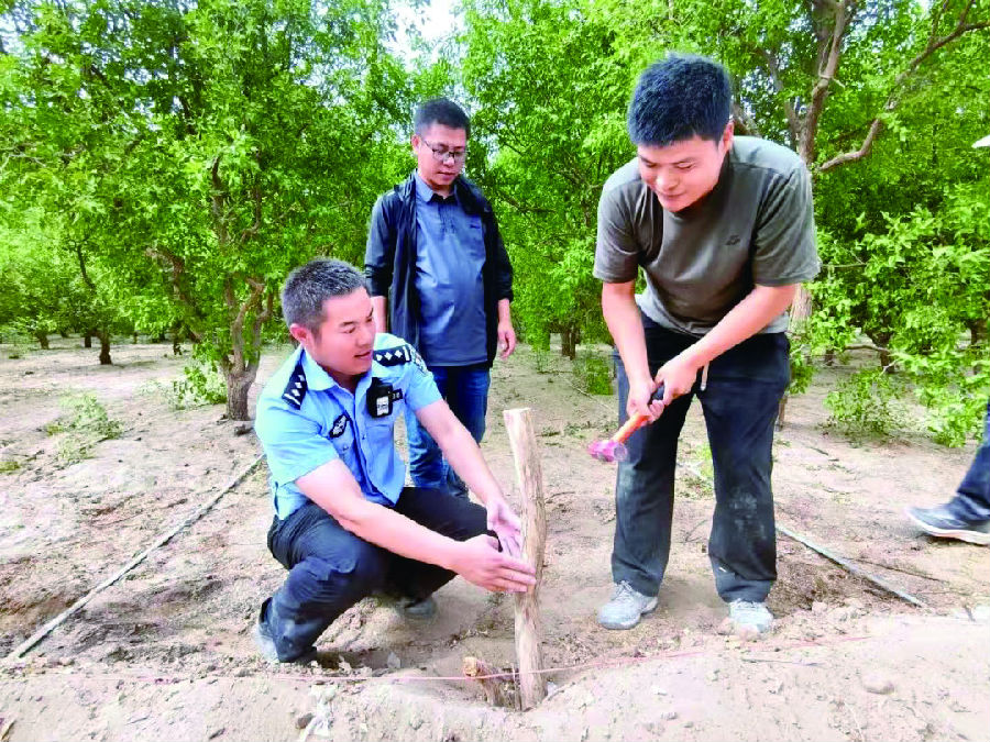 6月16日,金山派出所民警和第二师三十七团干部一起在红枣地敲桩定界。 受访单位供图