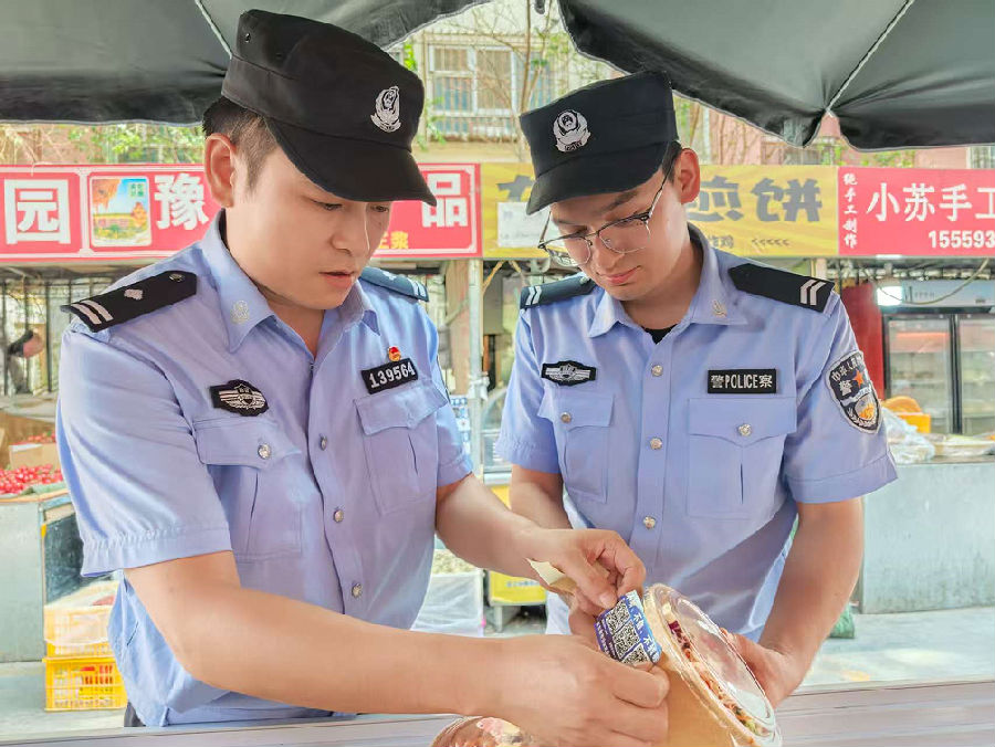 记者随库尔勒市公安局萨依巴格派出所博爱社区警务室民警李桃、惠居家市场经理庄洪林,顶着38℃的高温走进位于该市天山绿苑小区的市场,开展隐患排查和普法宣传,这是他们每天雷打不动的“必修课”。