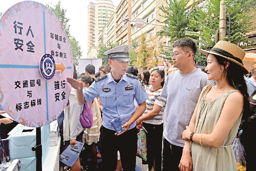 7月15日,自治区公安厅交警总队联手乌鲁木齐市公安局交警支队沙依巴克区大队,把普法课堂搬进乌市沙区和田二街,向游客普及交通安全知识,引导大家遵守交通规则,文明出行。石榴云/新疆法治报记者 单坤 摄