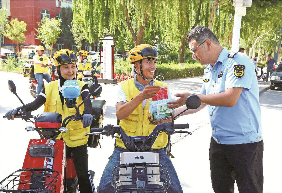 7月22日,在阿瓦提县阿瓦提镇花园社区爱心驿站,工作人员给外卖小哥送解暑用品。