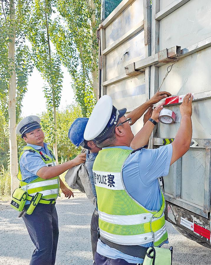 8月12日,阿克苏市公安局交警大队民警为农机车辆张贴反光贴。 李婕 摄