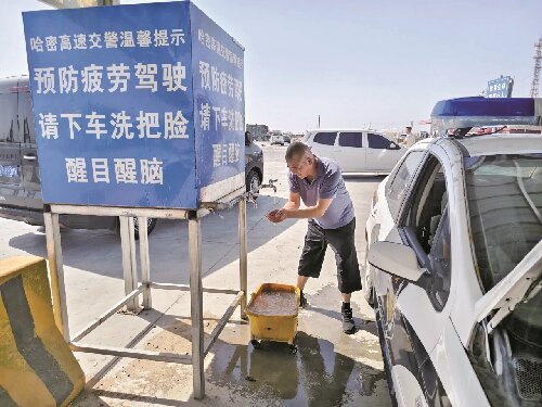 8月25日,一名驾驶人在G30连霍高速哈密服务区洗脸提神。 许晓鹏 摄