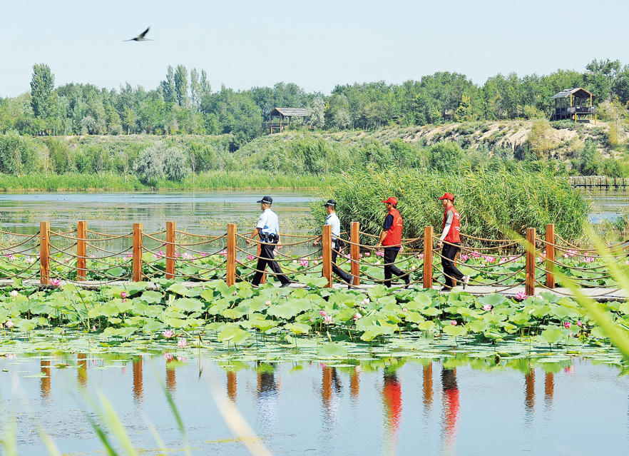 8月19日,玛纳斯县公安局兰州湾镇派出所八家户警务室民警与玛纳斯国家湿地公园管委会工作人员一同在玛纳斯国家湿地公园巡逻。 石榴云/新疆法治报记者 李进福 摄