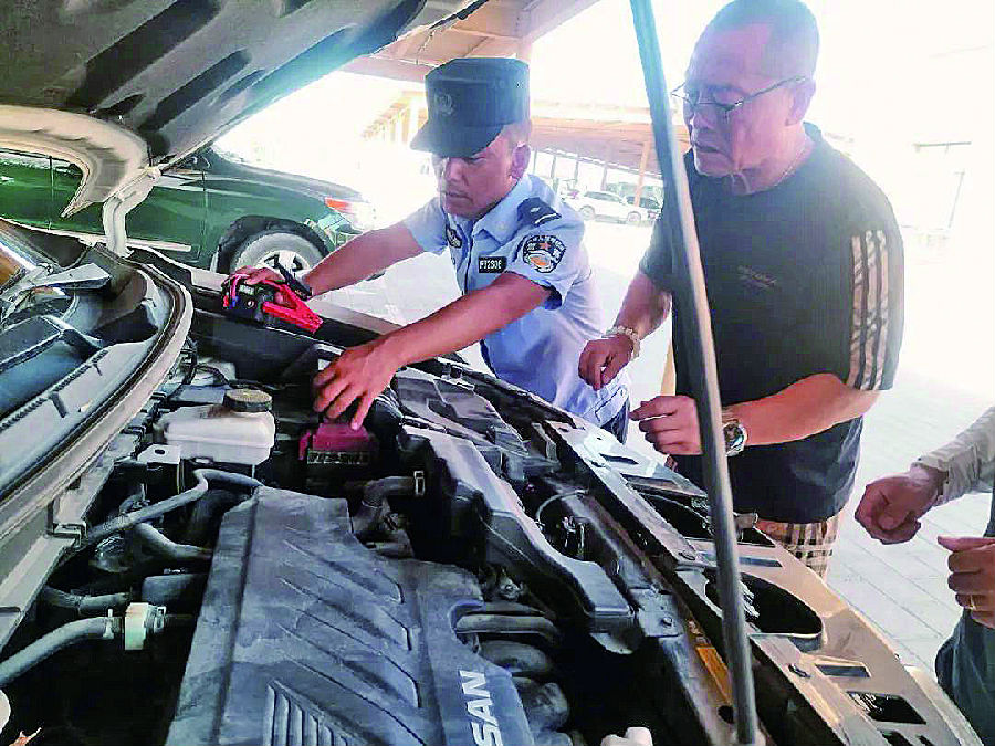 七月十一日,五堡镇派出所辅警排查群众车辆故障。 仲安伟 摄