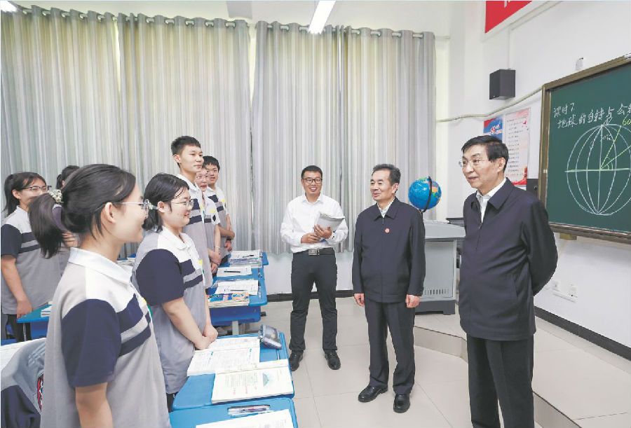 九月二十五日下午,受习近平总书记嘱托,中共中央政治局常委、全国政协主席、中央代表团团长王沪宁带领中央代表团部分成员在巴音郭楞蒙古自治州库尔勒市看望慰问当地各族干部群众。这是王沪宁和中央代表团部分成员在库尔勒市第二十三中学考察教育援疆情况。 新华社记者 姚大伟 摄