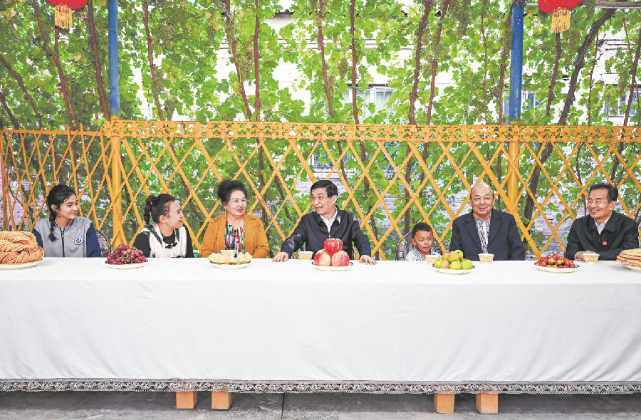 九月二十五日下午,受习近平总书记嘱托,中共中央政治局常委、全国政协主席、中央代表团团长王沪宁带领中央代表团部分成员在巴音郭楞蒙古自治州库尔勒市看望慰问当地各族干部群众。这是王沪宁和中央代表团部分成员在库尔勒市阿瓦提乡吾夏克铁热克村了解乡村产业发展和群众生产生活情况。 新华社记者 张领 摄