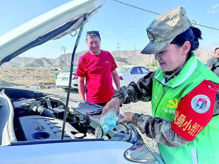 9月25日,乌恰县护边员为游客车辆添加玻璃水。2024年以来,乌恰县在护边员队伍中持续开展“身在西陲 心向党中央”忠诚教育,打造护边员服务之家,帮助过往群众和游客解决遇到的难题。石榴云/新疆法治报记者 王晨 摄