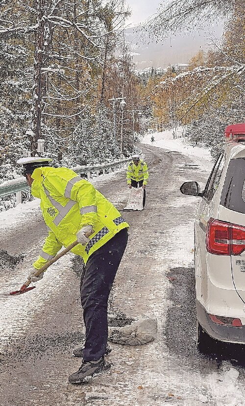 9月30日至10月5日,哈巴河县白哈巴景区出现雨转雪等恶劣天气,哈巴河县公安局交管大队抽调警力上路撒防滑沙,确保群众出行安全。 杜霖枫 摄