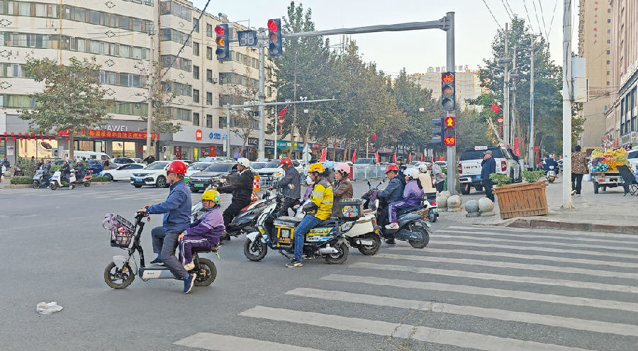 10月14日,和田市建设路与塔乃依南路交叉路口,过马路的电动自行车骑乘人员均戴了安全头盔。 张娟平 摄