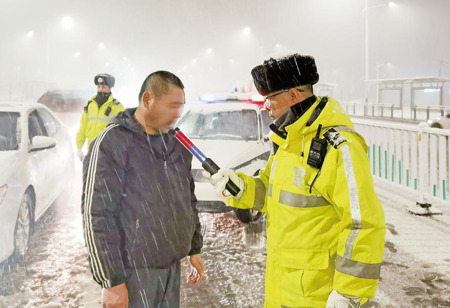 A+ | a11月22日晚,乌鲁木齐市迎来降雪天气,乌市公安局交管支队米东区大队在辖区设立临时检查点,严查酒驾醉驾,并做好雪天交通安全提示。图为该大队民警对过往驾驶员进行酒驾检查。