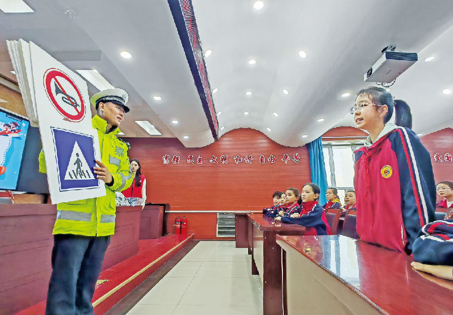 11月27日,乌鲁木齐市沙依巴克区八一街道博物馆社区联合乌市公安局交管支队沙依巴克区大队北园春片区中队,在乌鲁木齐市第55小学开展雪假交通安全知识宣传活动,通过“课堂+现场”的形式,为同学们送上雪假安全“第一课”。图为民警向同学们讲解交通标识的含义。