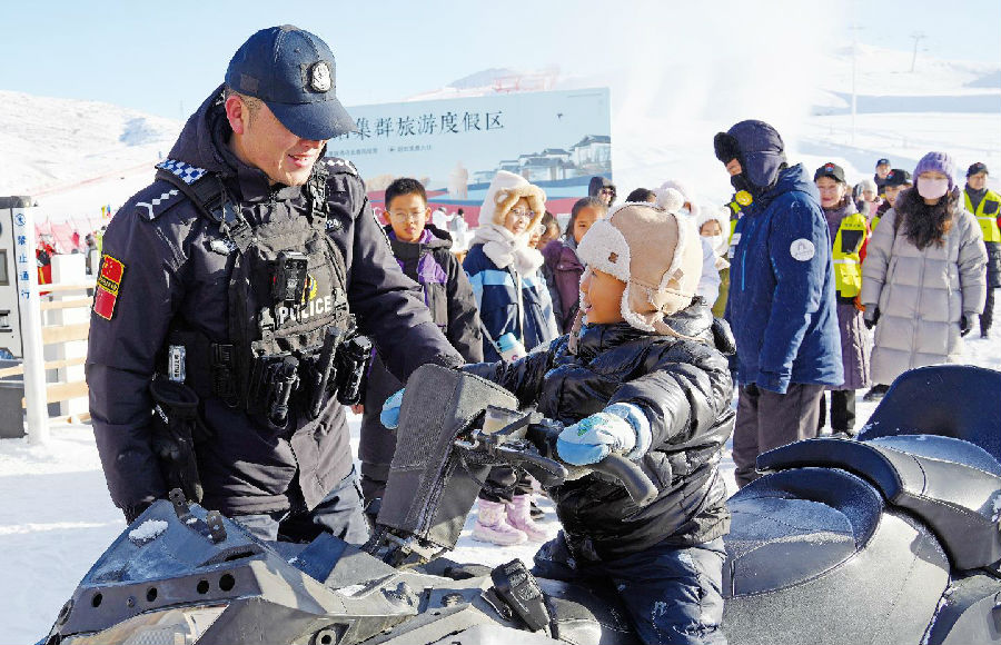 11月30日,阿勒泰市公安局解放路街道派出所将军山滑雪场警务室辅警向小朋友讲解雪地摩托的功能,让孩子们在趣味体验中掌握雪地安全要点。