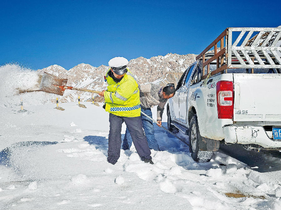 民警与牧民共同清理被困车辆周围的积雪。沙辉 摄