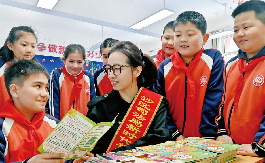 A+ | a3月10日,乌鲁木齐市沙依巴克区司法局长江路司法所工作人员走进乌市第24小学,开展普法宣传活动。工作人员结合真实案例讲解未成年人权益保护、防范学生欺凌等法律知识,引导学生增强法律意识和自我保护意识。图为工作人员带领学生学习《中华人民共和国民法典》。