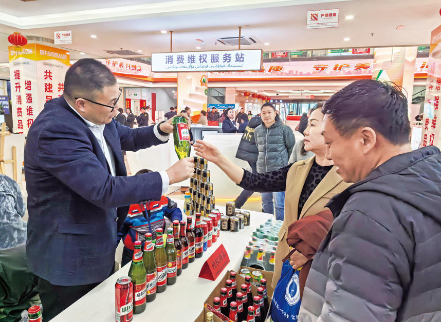 3月15日,新疆乌苏啤酒有限责任公司工作人员向消费者讲解真假啤酒的辨别方法。 石榴云/新疆法治报记者 龚彦晨 摄