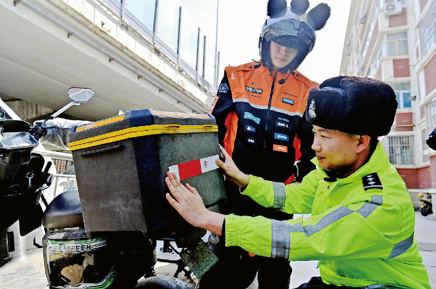 民警通过知识宣讲、免费张贴反光贴等形式,向外卖配送员等户外劳动者普及安全出行知识,提升防范能力。 石榴云/新疆法治报记者 单坤 摄
