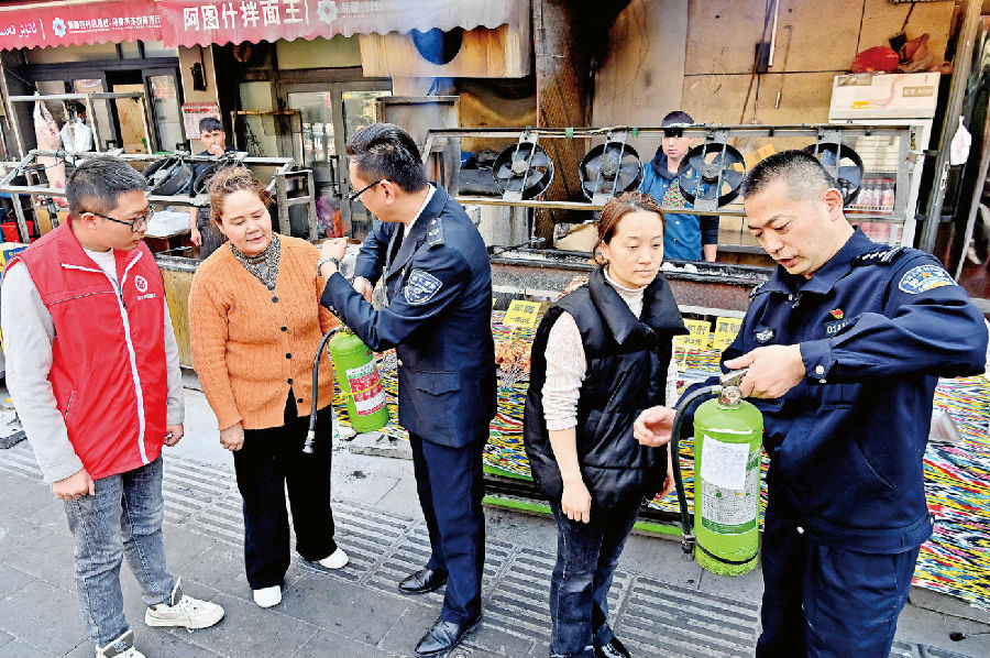 3月24日,乌鲁木齐市沙依巴克区和田街街道办事处联合多个社区,在和田二街小游园开展消防安全主题实操活动,邀请乌市公安局沙区分局和田街街道派出所民警以及乌市政安防火知识宣传中心等多部门专业人员,为辖区居民开展消防安全宣传和实操体验教学。图为民警为商户讲解灭火器的正确使用方法。 石榴云/新疆法治报记者 单坤 摄
