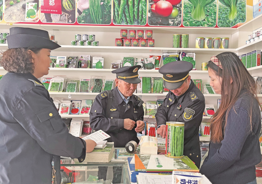 3月26日,伊犁哈萨克自治州农业综合行政执法支队工作人员在农资经销门店检查。