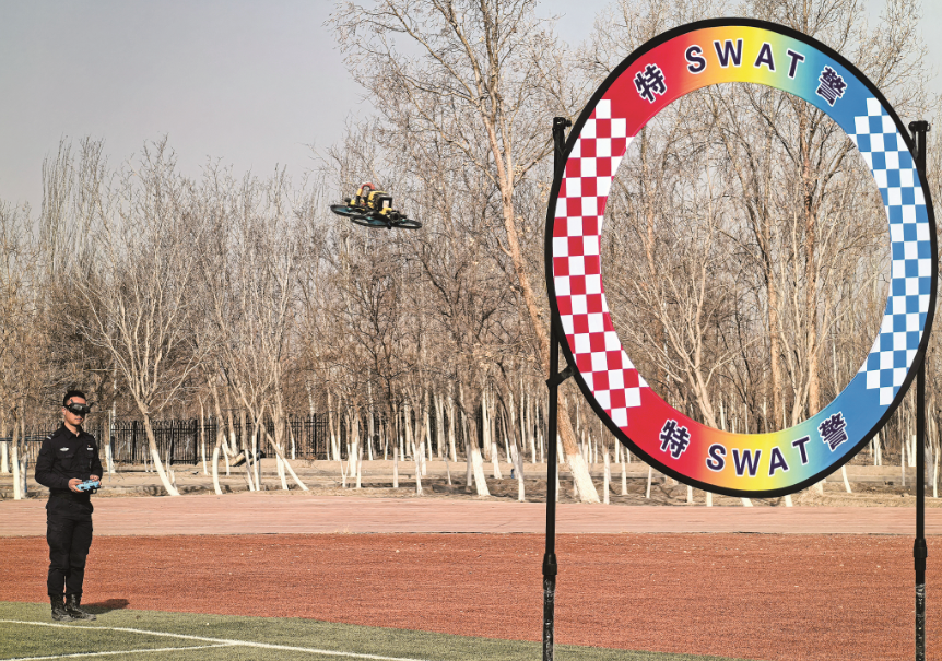 特警队员操控穿越机通过圆形障碍。 闫亚聪 摄