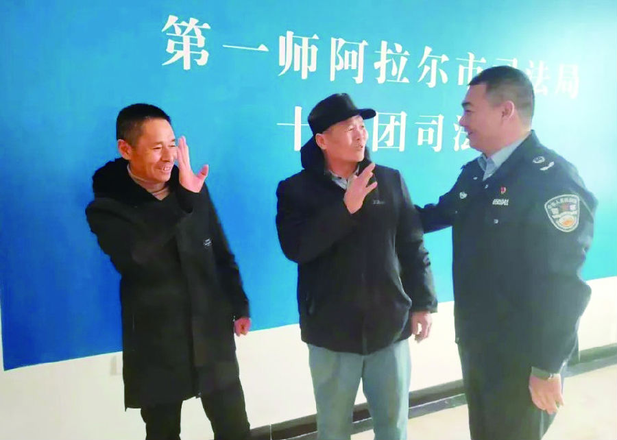 2024年春节前夕,兵团第一师阿拉尔市11团司法所干警化解一起涉农民工纠纷后,与当事人话别。 受访单位供图
