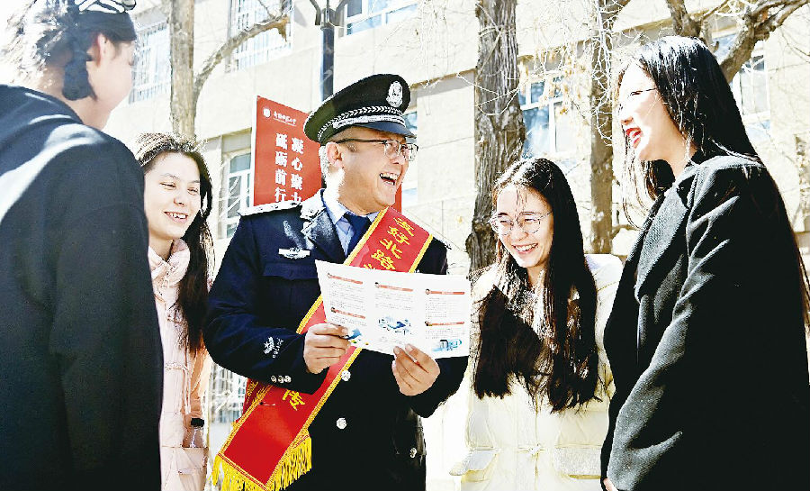3月19日,乌鲁木齐市公安局沙依巴克区分局友好北路派出所社区民警樊小政向大学生讲解反诈知识。