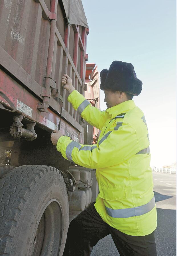 3月19日15时,呼图壁县公安局交警大队雀尔沟中队中队长丁彪固定货车篷布,确保行车安全。