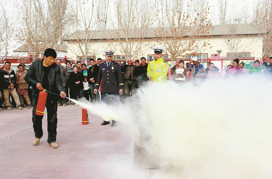 3月14日,沙雅县公安局交警大队联合该县消防救援大队,在古勒巴格镇开展春季安全乡村行宣传活动。工作人员通过主题讲座、案例分析和现场演练等方式,向群众讲解交通安全知识,普及消防常识,引导大家“春耕农忙 安全不忘”。图为村民学习使用灭火器。 王虎 摄