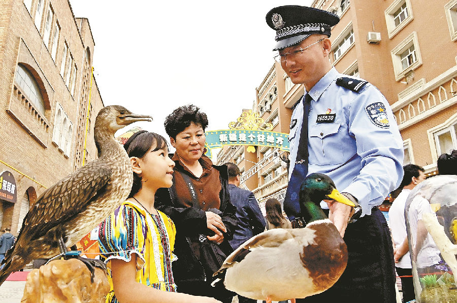 5月7日,自治区公安厅食品药品环境犯罪侦查局(森林公安局)民警刘峰云向群众讲解爱鸟护鸟知识。
