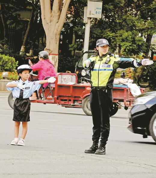 在民辅警的带领下,“小交警”制止骑乘电动自行车不按规定戴安全头盔、逆行、闯红灯、横穿马路等不文明交通行为,还来到该大队执勤点位,轮流协助民辅警指挥交通。