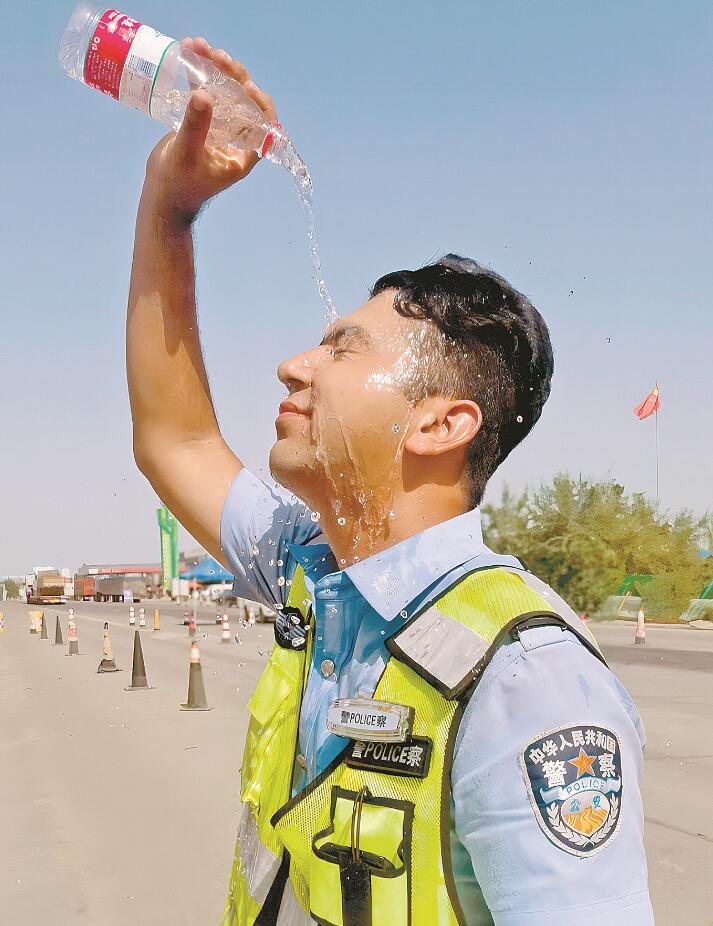 7月31日,阿克苏市公安局交警大队执勤民警用水降温。 冯志怡 摄