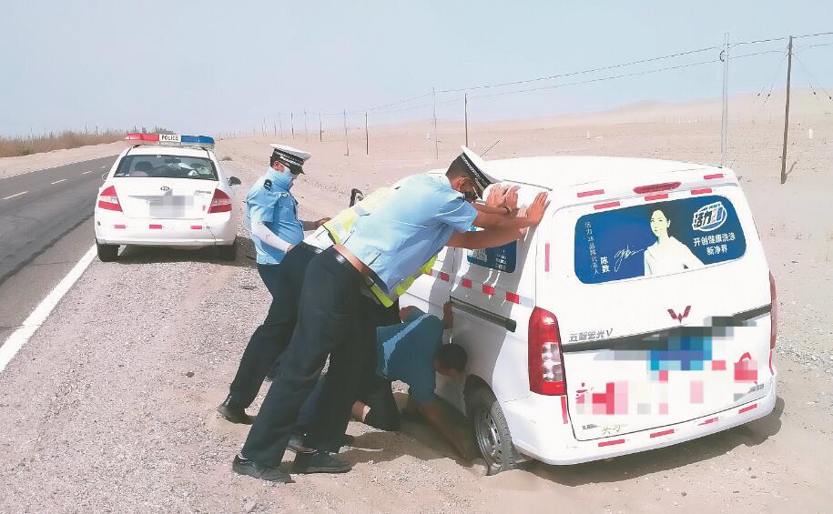 7月26日16时20分,洛浦县公安局交警大队民警在G580线612公里处救援被困车辆。 王杰 摄