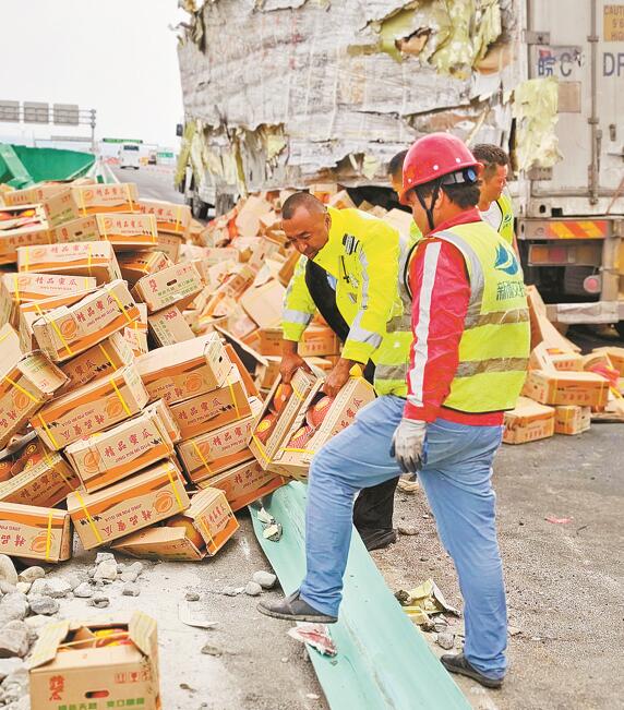 民警在车辆后方设置警示标志,同时进行远端分流管控,提醒过往车辆减速慢行。随后,民警向指挥中心请求支援并发动过往群众,在保证安全的前提下,帮助货车驾驶人清理、收集散落的哈密瓜,尽快恢复道路畅通。经过近4个小时合力搬运,散落在车道内的哈密瓜被全部清理,道路恢复通行。