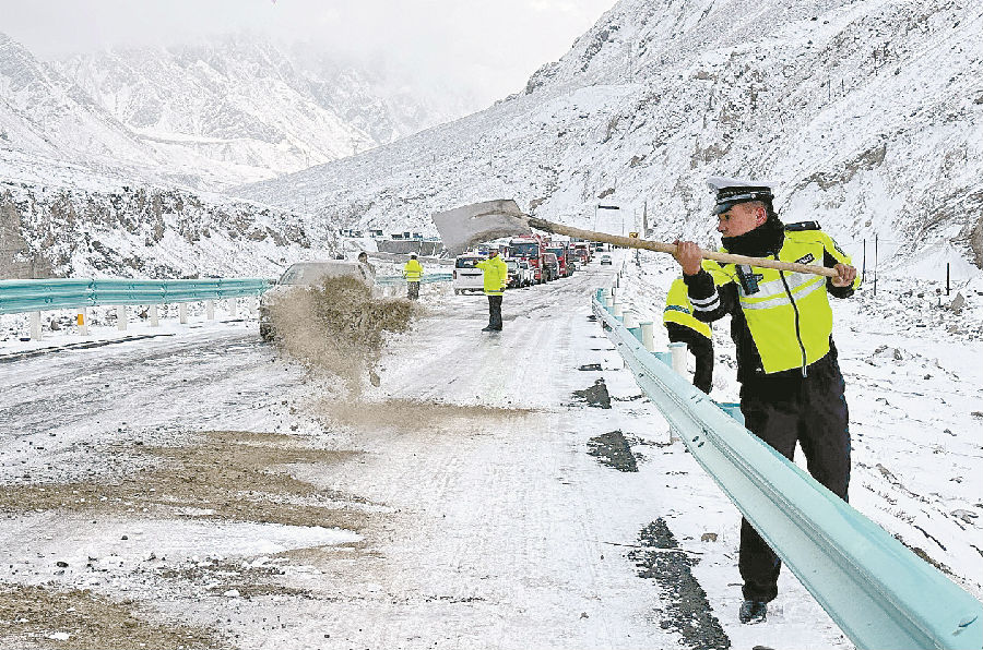 10月28日11时,天气转好,奥依塔克中队民警在上下坡路段撒防滑沙。不久后,滞留车辆全部驶离。